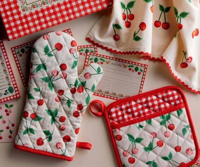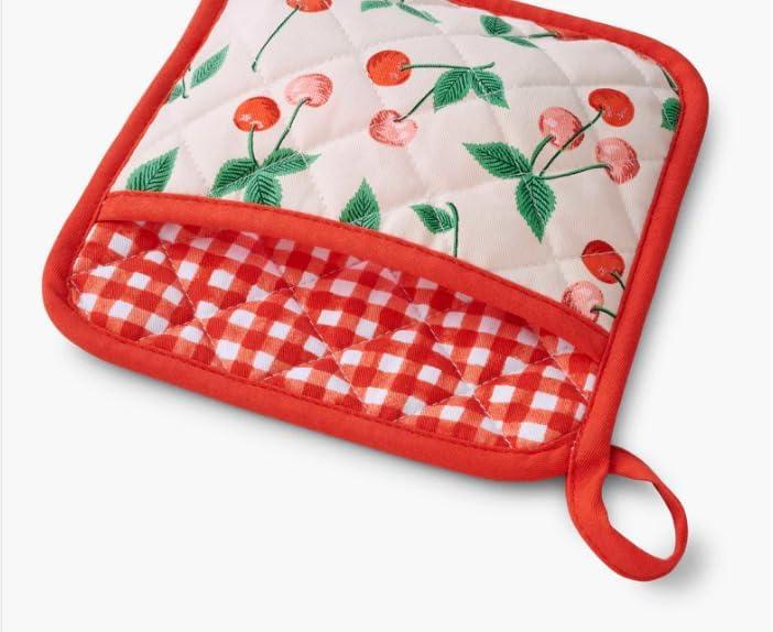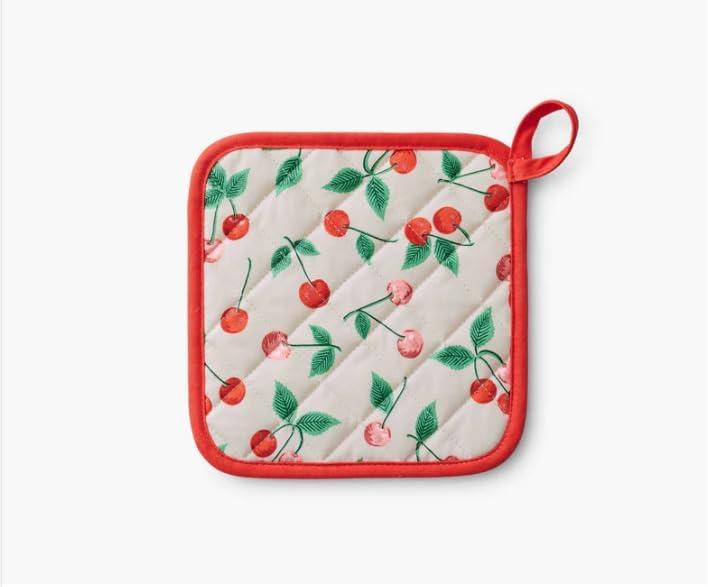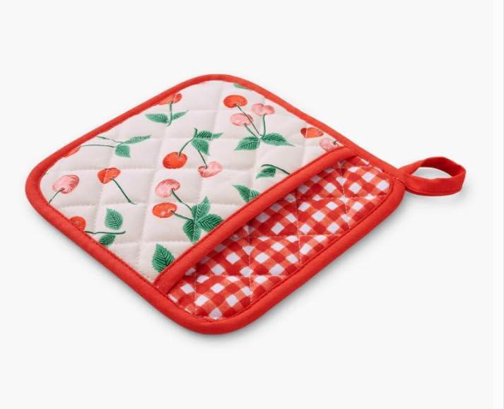 RIFLE PAPER CO. Pot Holder, Digitally Printed Cherry Pattern with Contrast Piping, Quilted Diamond Construction, Corner Loop for Hanging, Hand Slot, 8″ W x 8″ L