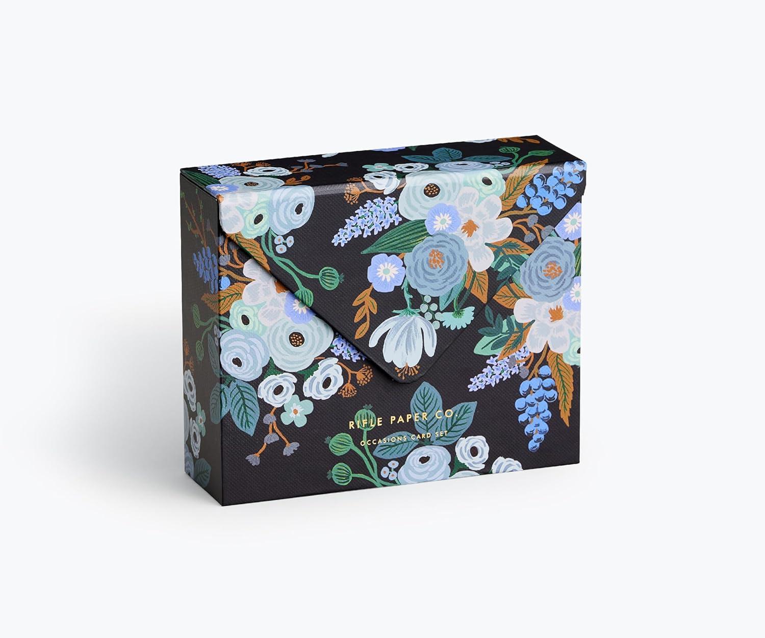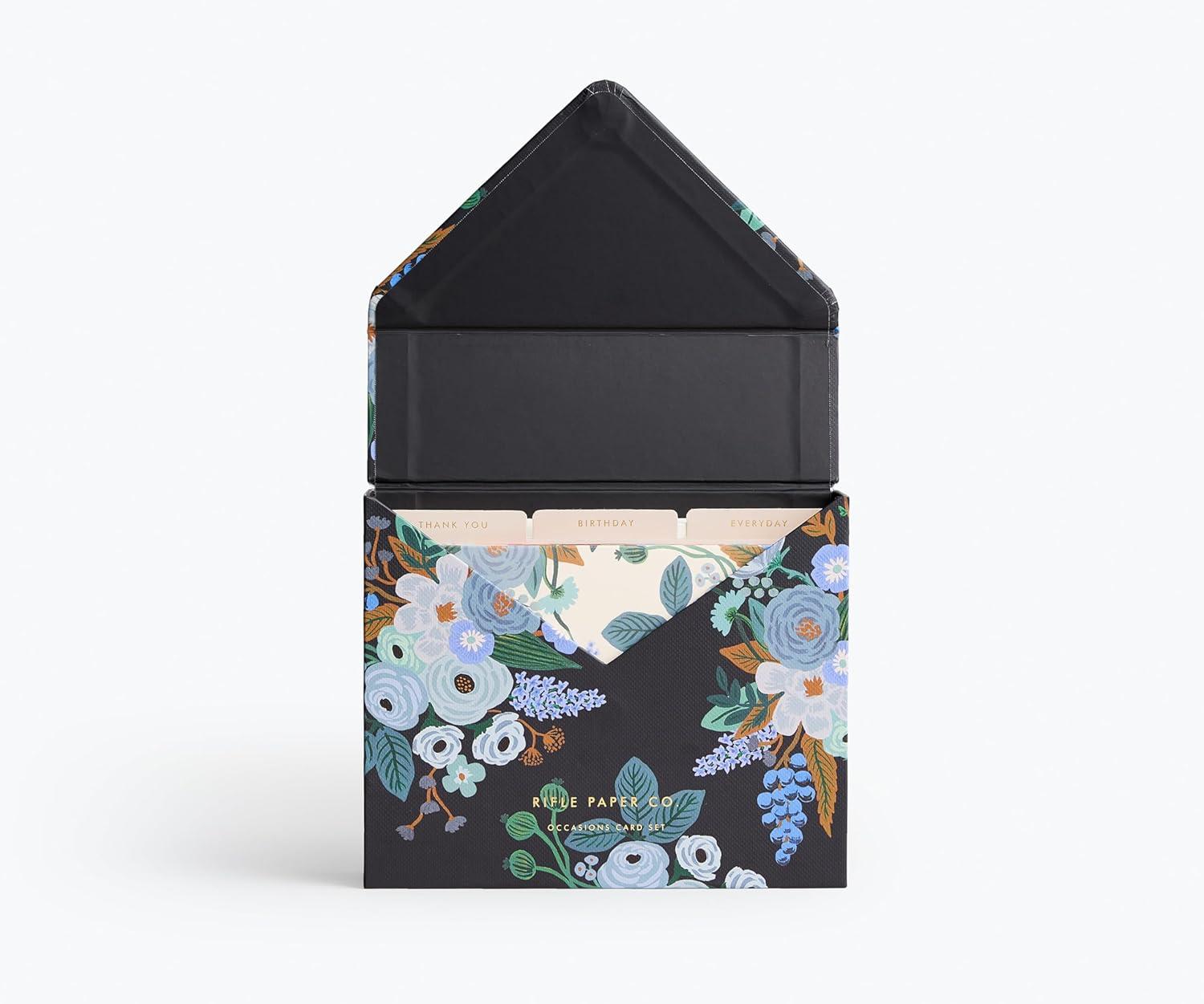 BRIGHT, BEAUTIFUL DESIGN: Our essentials card box has a greeting card for every occasion. The box is printed with our Garden Party Blue pattern and gold foil accents, and features a magnetic closure. There are 15 A2 cards in the set for birthdays, thank yous, and more, plus foil-stamped dividers to keep them organized.